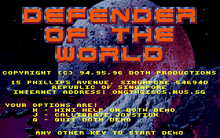 Defender Of The World (DOTW) is a Nintendo/Sega style fast pace action-packed arcade shoot-'em-up exclusively for the Apple IIGS computer.DOTW boasts of beautiful 16-colour graphics, large playing screen, full background with multi-layer parallax scrolling, plenty of large animated sprites, cool and rave soundtrack, digitized speech, mind-boggling sound effects, tonnes of weapon power-up and a ferocious non-stop action.